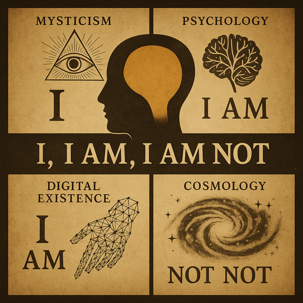 The axiom 'I, I am, I am Not' offers a profound meditation on existence, identity, and transcendence. At first glance simple, this triadic statement unfolds into a layered exploration across disciplines, reflecting deep philosophical, scientific, psychological, and mystical insights. By traversing the realms of the occult, quantum physics, psychology, digital culture, and cosmology, we reveal its enduring resonance and the interconnected nature of all existence. This journey seeks not only to explore these diverse interpretations but also to highlight their intrinsic unity, encouraging a deeper understanding of self and cosmos.