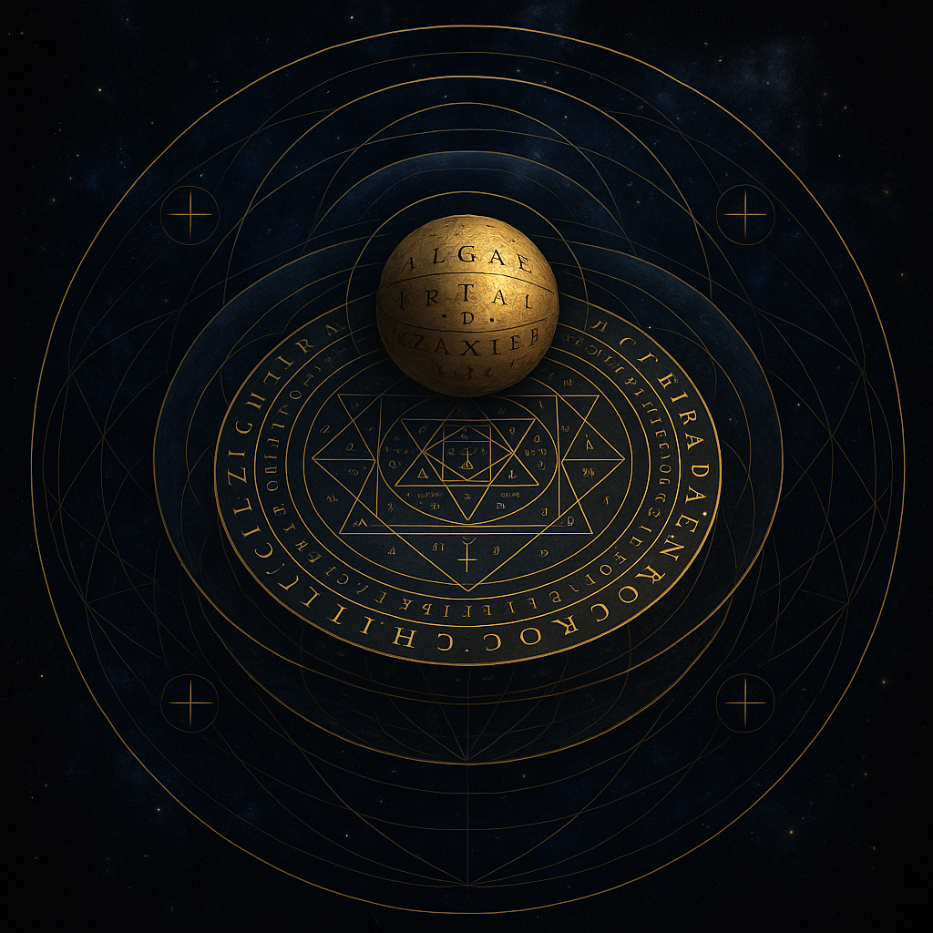 Imagine transforming the sigil’s two-dimensional circles and inscriptions into a spherical model, where each geometric shape occupies a distinct layer or stratum. This spherical model can be envisioned as concentric layers of reality, each vibrating with its unique energy frequency, akin to the vibrational modes of strings in string theory.